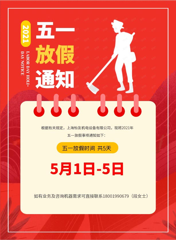上海怡友機電設備公司決定,2021勞動節(jié)放假及調休安排時間如下,2021年五月一日-2021年五月5日共五天,期間廣大客戶如有咨詢需要可直接聯(lián)系18001990679(段女士)